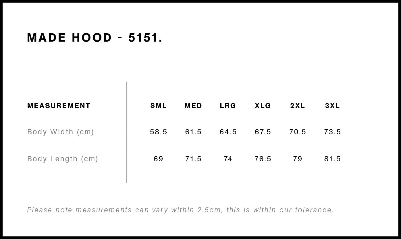 The Made Hood is our most heavy weight hood. It offers a relaxed fit with dropped shoulders. Made from heavy weight 500gsm 100% Cotton French Terry, it delivers a premium feel and durability. Featuring a kangaroo pocket and no drawcord. Preshrunk to minimise shrinkage, built to last.